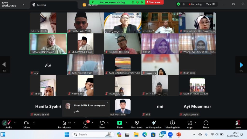 Pekanbaru – Program Studi Magister Pendidikan Bahasa Arab (S2 PBA) Universitas Islam Negeri Sultan Syarif Kasim (UIN Suska) Riau menggelar webinar nasional dengan tema “Peran Pendidikan Bahasa Arab dalam Meningkatkan Kompetensi Global di Era Digital, pada hari kamis 23 Oktober 2025. Kegiatan ini berlangsung secara daring melalui platform Zoom dan berhasil menarik perhatian 128 peserta baik dari dalam dan luar negeri dan berasal dari bebagai kalangan,  dosen, mahasiswa, guru Bahasa Arab, serta pemerhati bahasa Arab, ini menunjukkan tingginya minat terhadap isu integrasi Bahasa Arab dan tuntutan era digital.