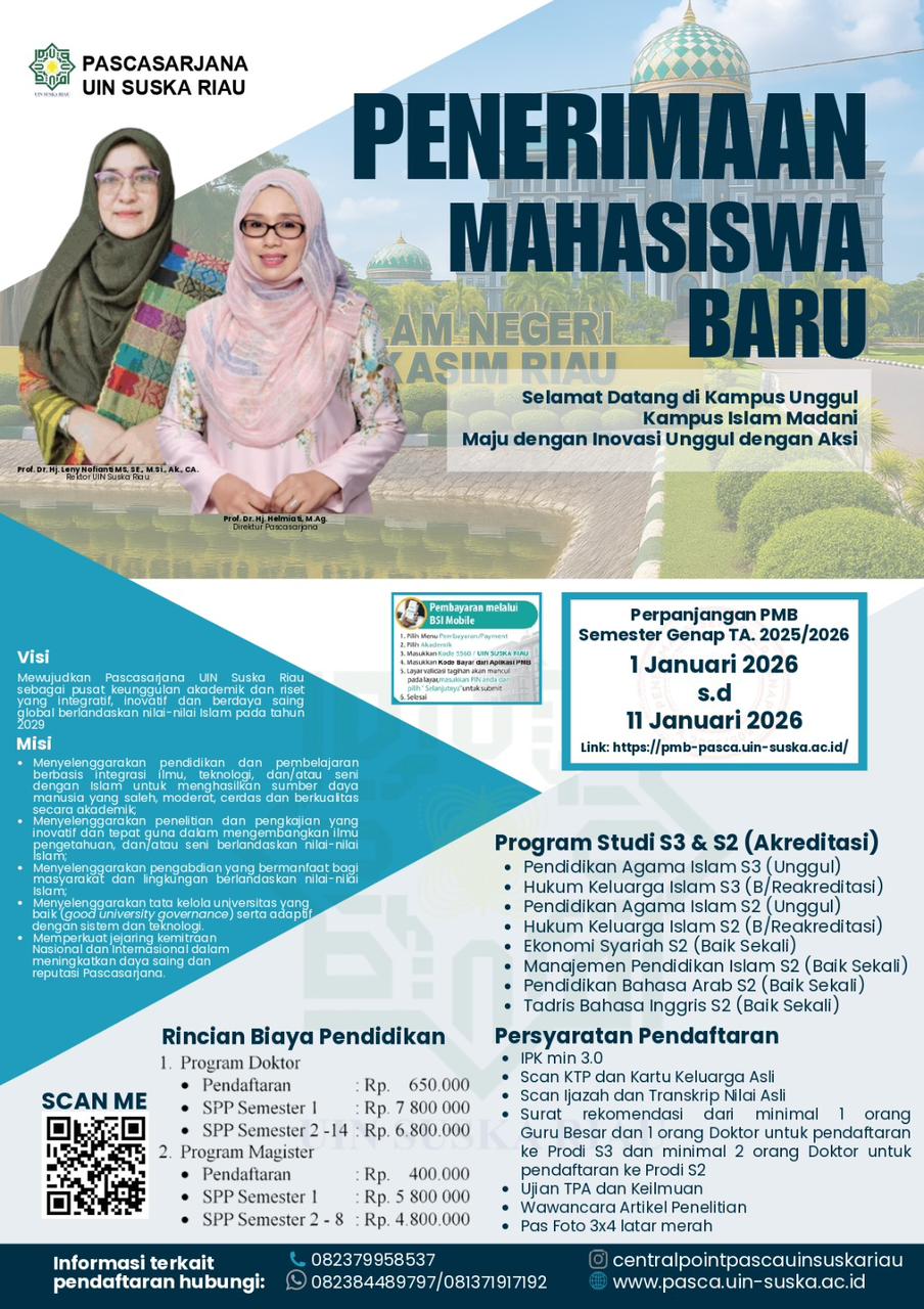 Perpanjangan Penerimaan Mahasiswa Baru Semester Genap TA 2025/2026 Pascasarjana UIN Sultan Syarif Kasim Riau