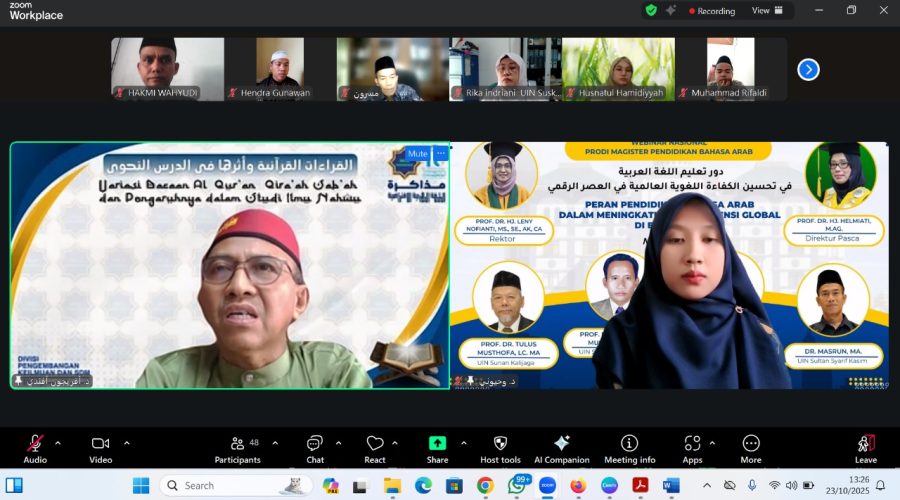 Pekanbaru – Program Studi Magister Pendidikan Bahasa Arab (S2 PBA) Universitas Islam Negeri Sultan Syarif Kasim (UIN Suska) Riau menggelar webinar nasional dengan tema “Peran Pendidikan Bahasa Arab dalam Meningkatkan Kompetensi Global di Era Digital”, pada hari kamis 23 Oktober 2025. Kegiatan ini berlangsung secara daring melalui platform Zoom dan berhasil menarik perhatian 128 peserta baik dari dalam dan luar negeri dan berasal dari bebagai kalangan,  dosen, mahasiswa, guru Bahasa...